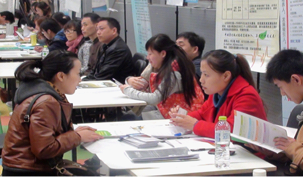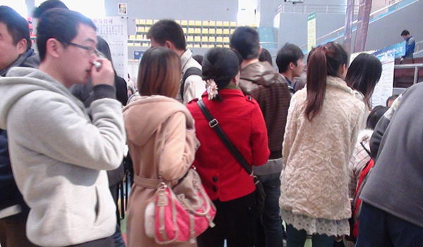一起來看看招聘會的現場吧,求職的學生都在場館內找著自己滿意的企業后,在耐心地等候前面面試的同學。 |